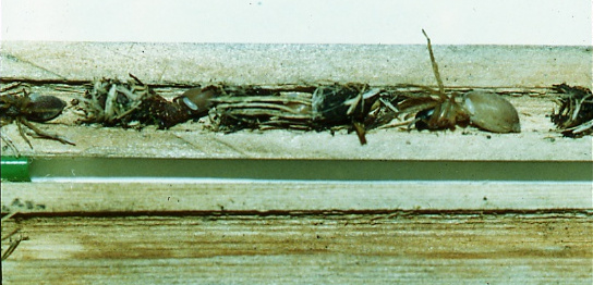 The matrix is tied to a pole or tree with rope. Each stick within the matrix can be split to permit inspection, which is typically performed in-situ.